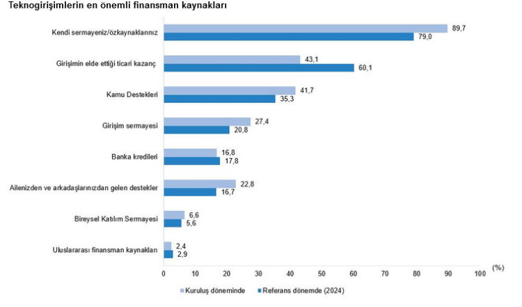 Araştırmaya göre teknogirişimlerin en önemli finansman kaynağı özkaynaklar oldu. Kuruluş aşamasında bu oran yüzde 89,7 iken, 2024’te yüzde 79,0 olarak gerçekleşti. Girişimlerin yüzde 54,4’ü yeni finansman arayışına girerken, büyük kısmı gelen yatırım tekliflerini yetersiz buldu.