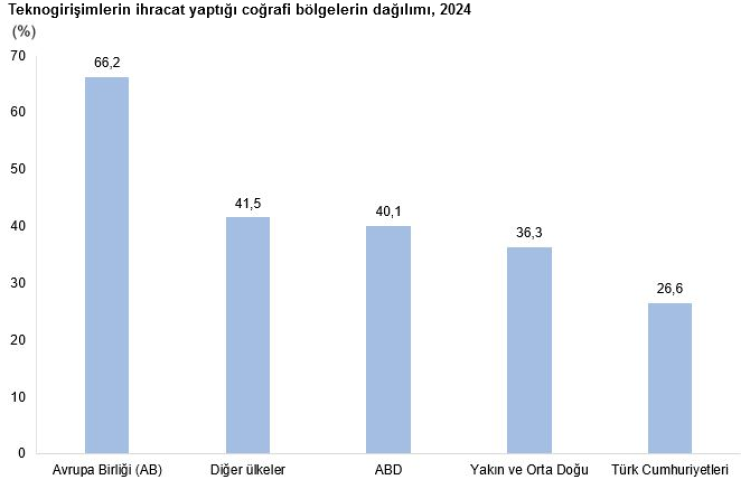 Dijitalleşme tarafında, teknogirişimlerin yüzde 22,2’si e-satış yaptı. Yurt dışı e-satışlarda ve ihracatta Avrupa Birliği ilk sırada yer aldı. Ar-Ge faaliyeti yürüten girişimlerin ihracat oranı (yüzde 25,6), Ar-Ge yapmayanların yaklaşık iki katı oldu.
