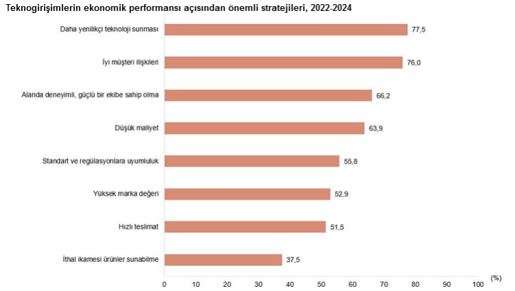 Son olarak teknogirişimler, 2022-2024 döneminde ekonomik performansı artıran en önemli unsurun yenilikçi teknoloji sunmak olduğunu vurguladı. İyi müşteri ilişkileri ve deneyimli ekipler de rekabet avantajının temel bileşenleri arasında yer aldı.